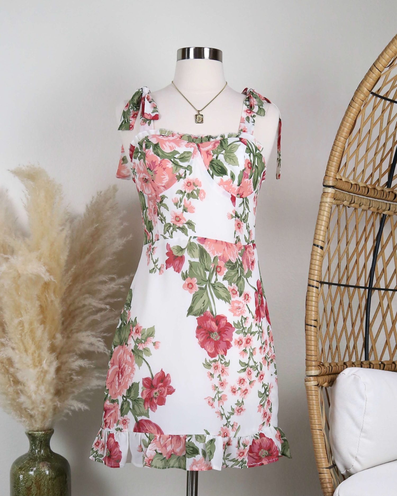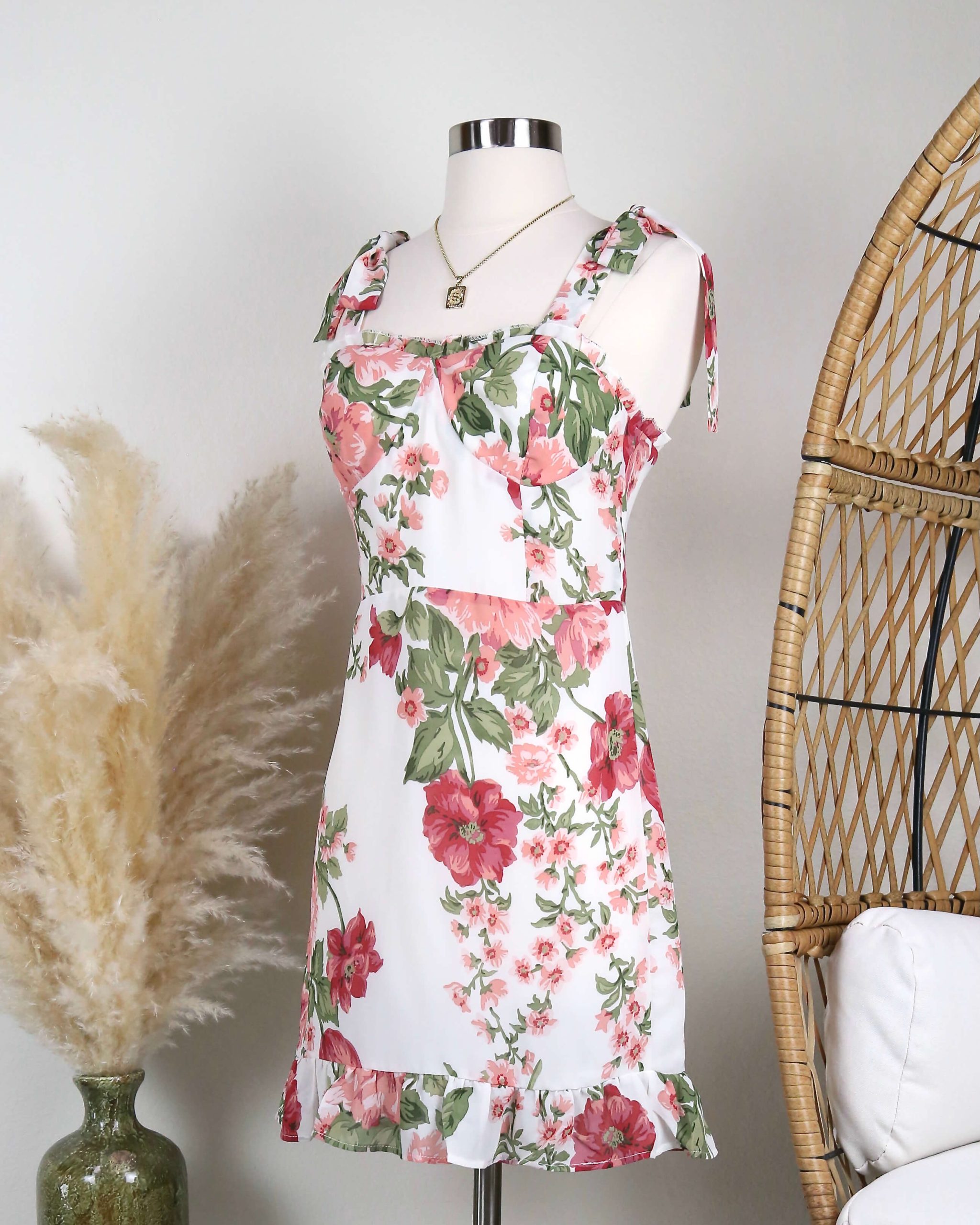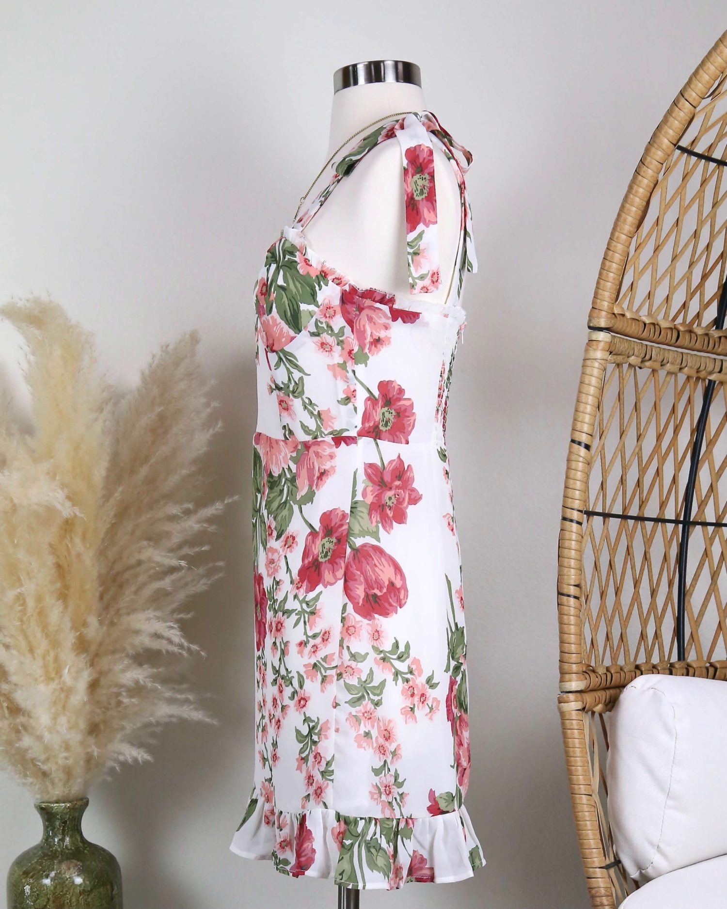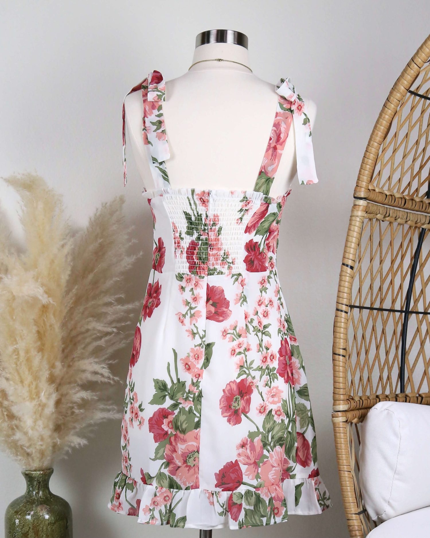 This beautifully constructed dress features a tie strap design, smock back with hidden zipper, romantic floral prints and a chiffon like fabric design.