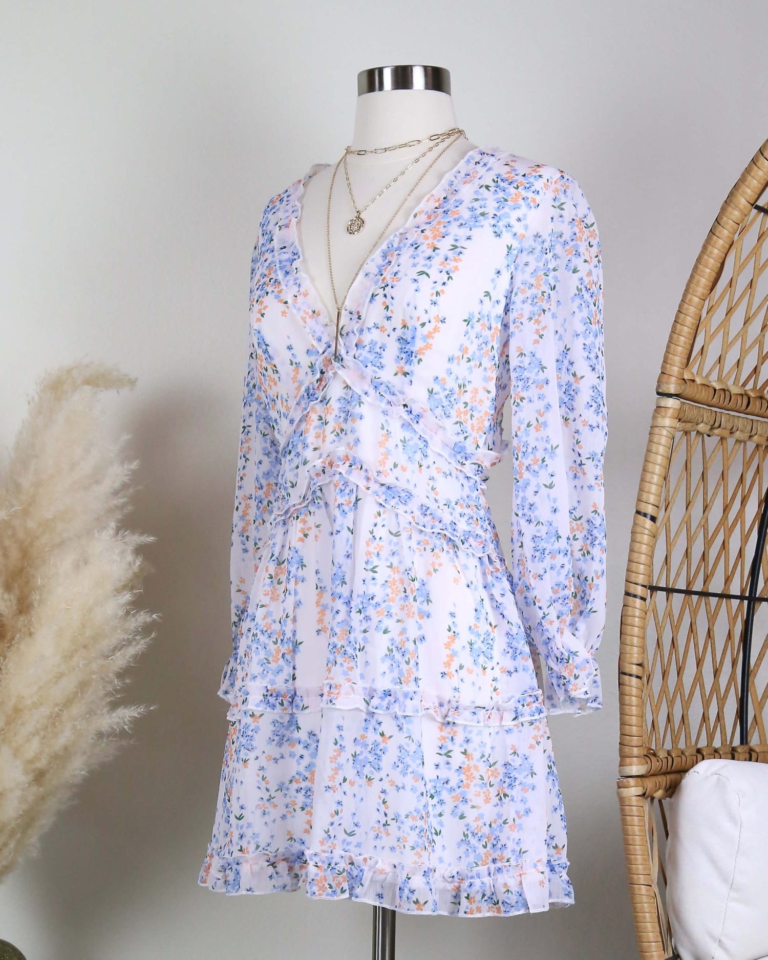 This gorgeous dress features a V-Neck, ruffle trimmings, and an open back.